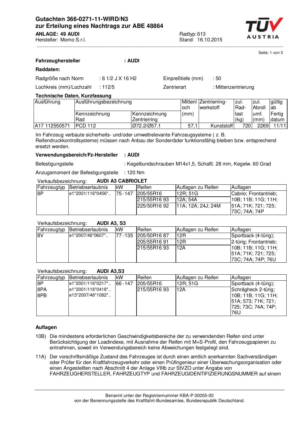 Felgengutachten / ABE für Alufelgen Momo WIN_PRO (6.5Jx16 ET 0, Mittenloch 0 mm) mit KBA 48864 (Zertifikatsnummer 366-0271-11-WIRD/N3__Anlage_49). Hier kostenlos als PDF herunterladen. Der Download-Link ist 24 Stunden gültig und kann bis zu zwei Mal verwendet werden.
