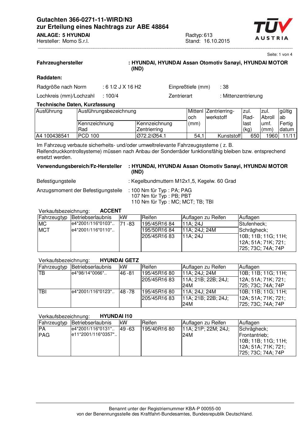 Felgengutachten / ABE für Alufelgen Momo WIN_PRO (6.5Jx16 ET 0, Mittenloch 0 mm) mit KBA 48864 (Zertifikatsnummer 366-0271-11-WIRD/N3__Anlage_5). Hier kostenlos als PDF herunterladen. Der Download-Link ist 24 Stunden gültig und kann bis zu zwei Mal verwendet werden.