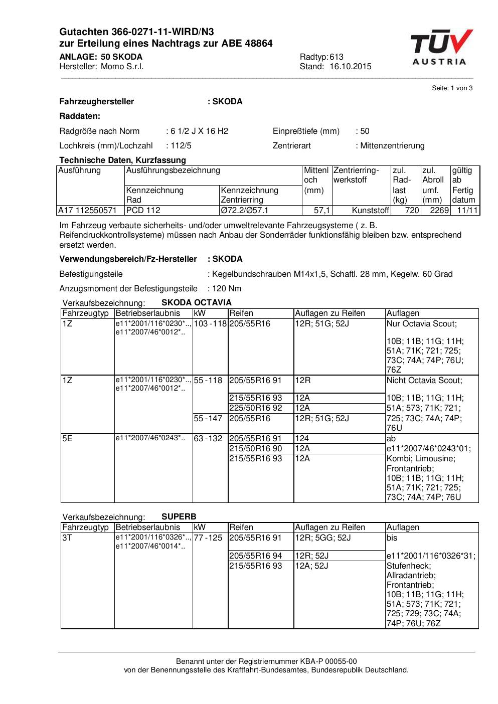 Felgengutachten / ABE für Alufelgen Momo WIN_PRO (6.5Jx16 ET 0, Mittenloch 0 mm) mit KBA 48864 (Zertifikatsnummer 366-0271-11-WIRD/N3__Anlage_50). Hier kostenlos als PDF herunterladen. Der Download-Link ist 24 Stunden gültig und kann bis zu zwei Mal verwendet werden.