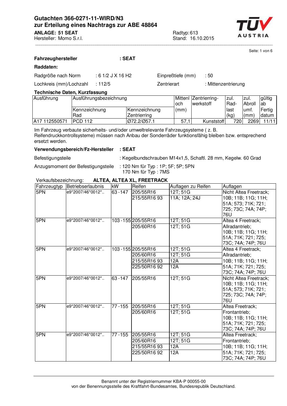 Felgengutachten / ABE für Alufelgen Momo WIN_PRO (6.5Jx16 ET 0, Mittenloch 0 mm) mit KBA 48864 (Zertifikatsnummer 366-0271-11-WIRD/N3__Anlage_51). Hier kostenlos als PDF herunterladen. Der Download-Link ist 24 Stunden gültig und kann bis zu zwei Mal verwendet werden.