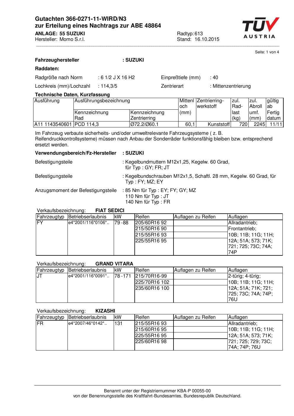 Felgengutachten / ABE für Alufelgen Momo WIN_PRO (6.5Jx16 ET 0, Mittenloch 0 mm) mit KBA 48864 (Zertifikatsnummer 366-0271-11-WIRD/N3__Anlage_55). Hier kostenlos als PDF herunterladen. Der Download-Link ist 24 Stunden gültig und kann bis zu zwei Mal verwendet werden.