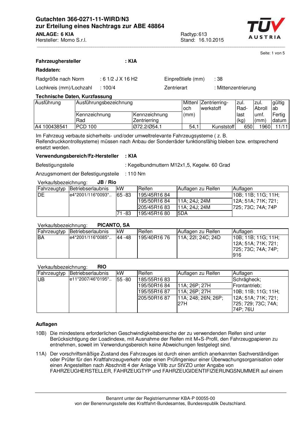 Felgengutachten / ABE für Alufelgen Momo WIN_PRO (6.5Jx16 ET 0, Mittenloch 0 mm) mit KBA 48864 (Zertifikatsnummer 366-0271-11-WIRD/N3__Anlage_6). Hier kostenlos als PDF herunterladen. Der Download-Link ist 24 Stunden gültig und kann bis zu zwei Mal verwendet werden.