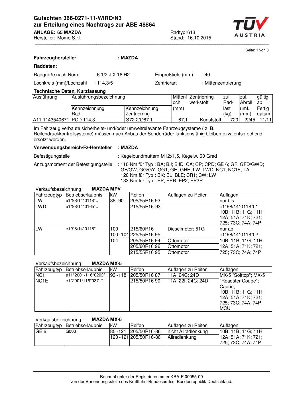 Felgengutachten / ABE für Alufelgen Momo WIN_PRO (6.5Jx16 ET 0, Mittenloch 0 mm) mit KBA 48864 (Zertifikatsnummer 366-0271-11-WIRD/N3__Anlage_65). Hier kostenlos als PDF herunterladen. Der Download-Link ist 24 Stunden gültig und kann bis zu zwei Mal verwendet werden.