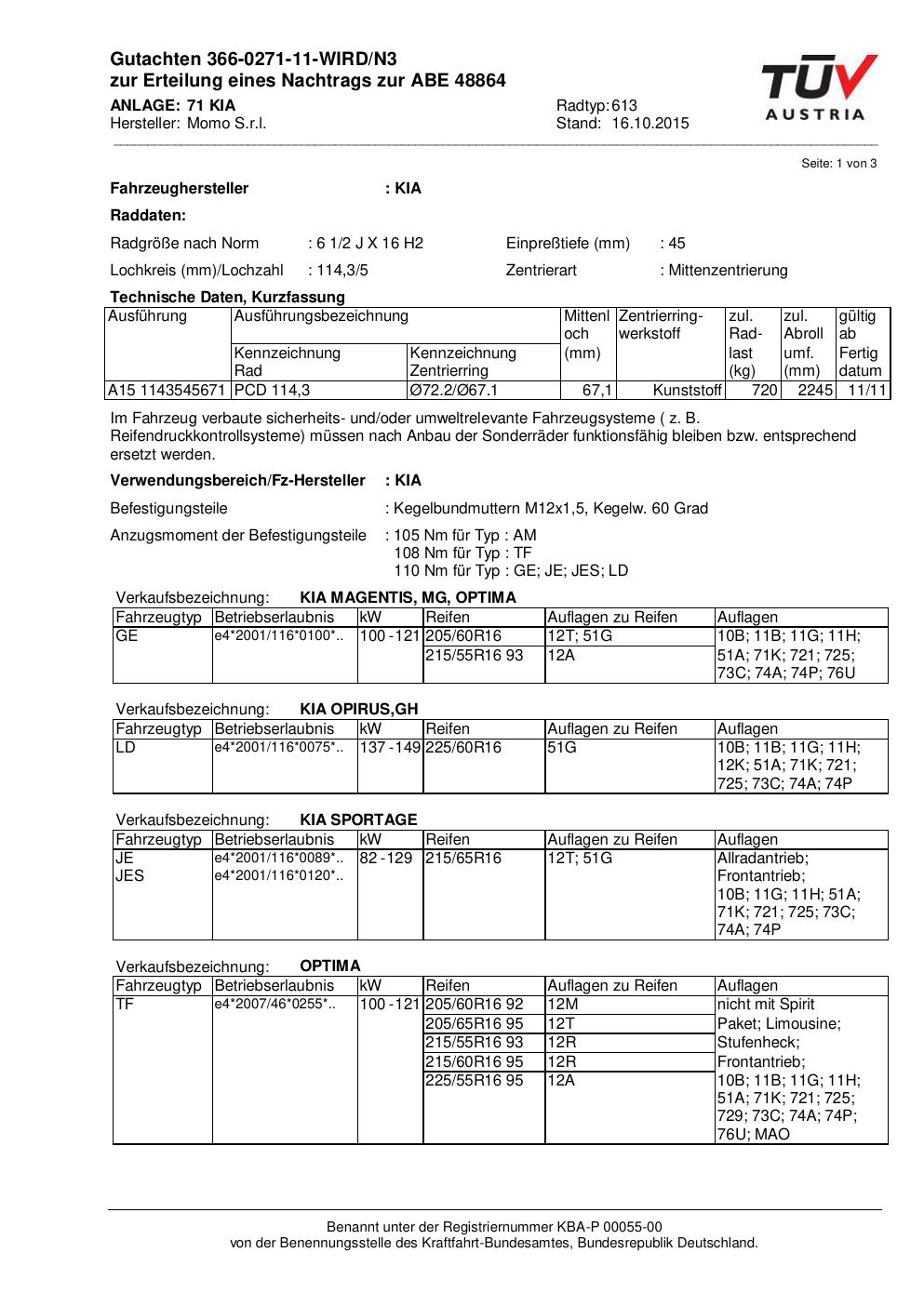 Felgengutachten / ABE für Alufelgen Momo WIN_PRO (6.5Jx16 ET 0, Mittenloch 0 mm) mit KBA 48864 (Zertifikatsnummer 366-0271-11-WIRD/N3__Anlage_71). Hier kostenlos als PDF herunterladen. Der Download-Link ist 24 Stunden gültig und kann bis zu zwei Mal verwendet werden.