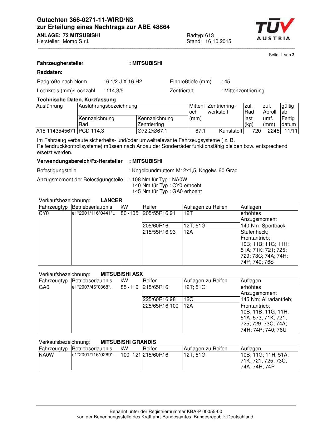 Felgengutachten / ABE für Alufelgen Momo WIN_PRO (6.5Jx16 ET 0, Mittenloch 0 mm) mit KBA 48864 (Zertifikatsnummer 366-0271-11-WIRD/N3__Anlage_72). Hier kostenlos als PDF herunterladen. Der Download-Link ist 24 Stunden gültig und kann bis zu zwei Mal verwendet werden.