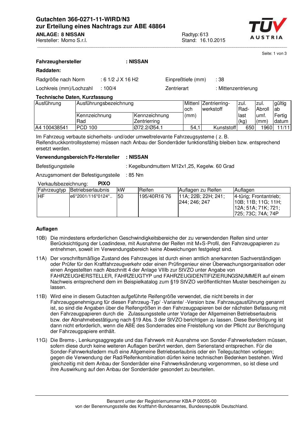 Felgengutachten / ABE für Alufelgen Momo WIN_PRO (6.5Jx16 ET 0, Mittenloch 0 mm) mit KBA 48864 (Zertifikatsnummer 366-0271-11-WIRD/N3__Anlage_8). Hier kostenlos als PDF herunterladen. Der Download-Link ist 24 Stunden gültig und kann bis zu zwei Mal verwendet werden.