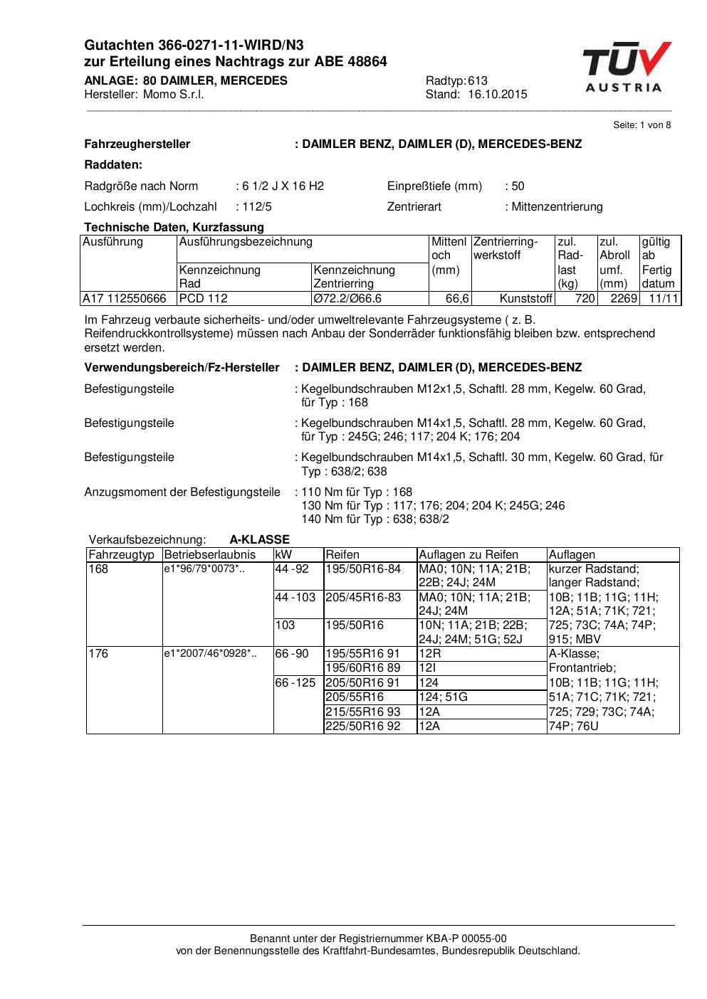Felgengutachten / ABE für Alufelgen Momo WIN_PRO (6.5Jx16 ET 0, Mittenloch 0 mm) mit KBA 48864 (Zertifikatsnummer 366-0271-11-WIRD/N3__Anlage_80). Hier kostenlos als PDF herunterladen. Der Download-Link ist 24 Stunden gültig und kann bis zu zwei Mal verwendet werden.