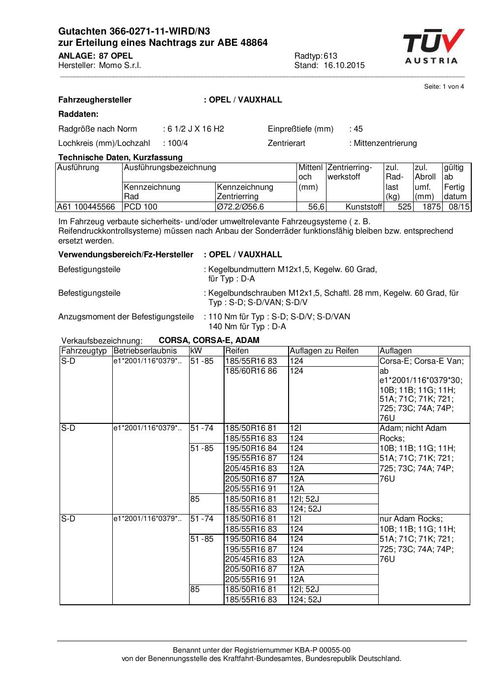 Felgengutachten / ABE für Alufelgen Momo WIN_PRO (6.5Jx16 ET 0, Mittenloch 0 mm) mit KBA 48864 (Zertifikatsnummer 366-0271-11-WIRD/N3__Anlage_87). Hier kostenlos als PDF herunterladen. Der Download-Link ist 24 Stunden gültig und kann bis zu zwei Mal verwendet werden.