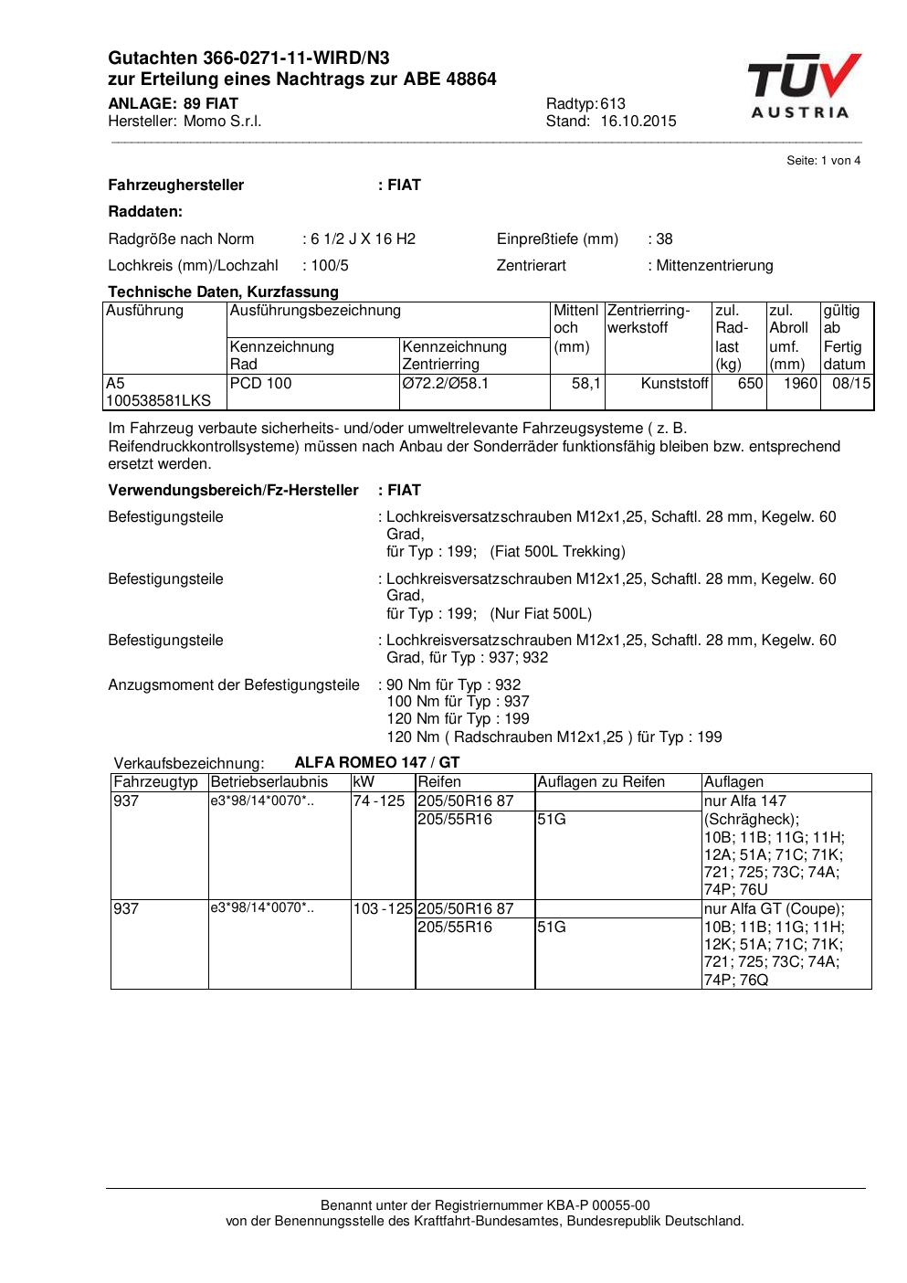 Felgengutachten / ABE für Alufelgen Momo WIN_PRO (6.5Jx16 ET 0, Mittenloch 0 mm) mit KBA 48864 (Zertifikatsnummer 366-0271-11-WIRD/N3__Anlage_89). Hier kostenlos als PDF herunterladen. Der Download-Link ist 24 Stunden gültig und kann bis zu zwei Mal verwendet werden.