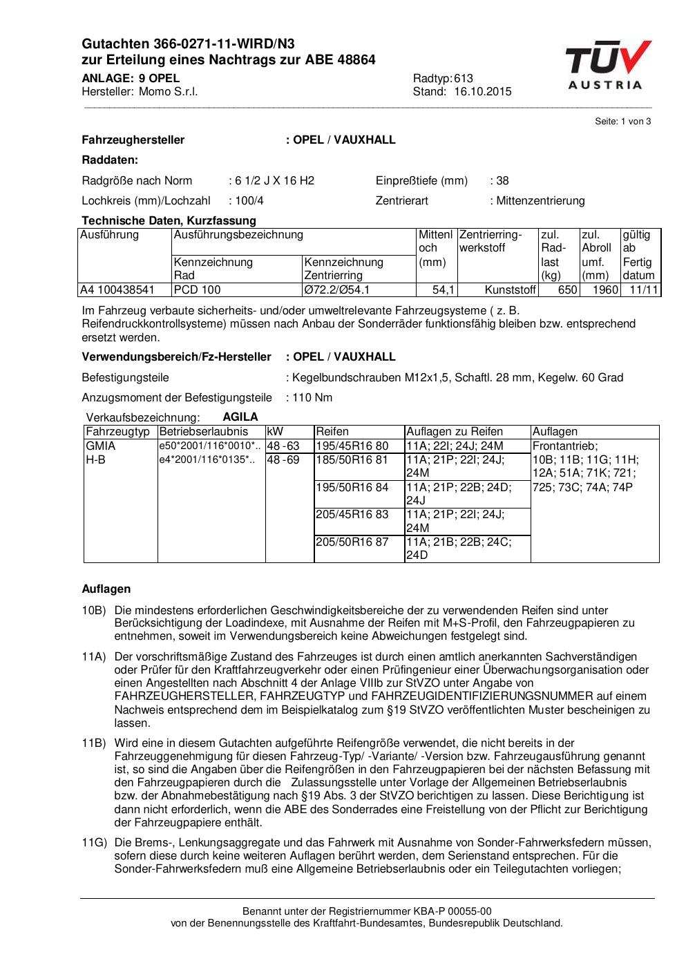 Felgengutachten / ABE für Alufelgen Momo WIN_PRO (6.5Jx16 ET 0, Mittenloch 0 mm) mit KBA 48864 (Zertifikatsnummer 366-0271-11-WIRD/N3__Anlage_9). Hier kostenlos als PDF herunterladen. Der Download-Link ist 24 Stunden gültig und kann bis zu zwei Mal verwendet werden.