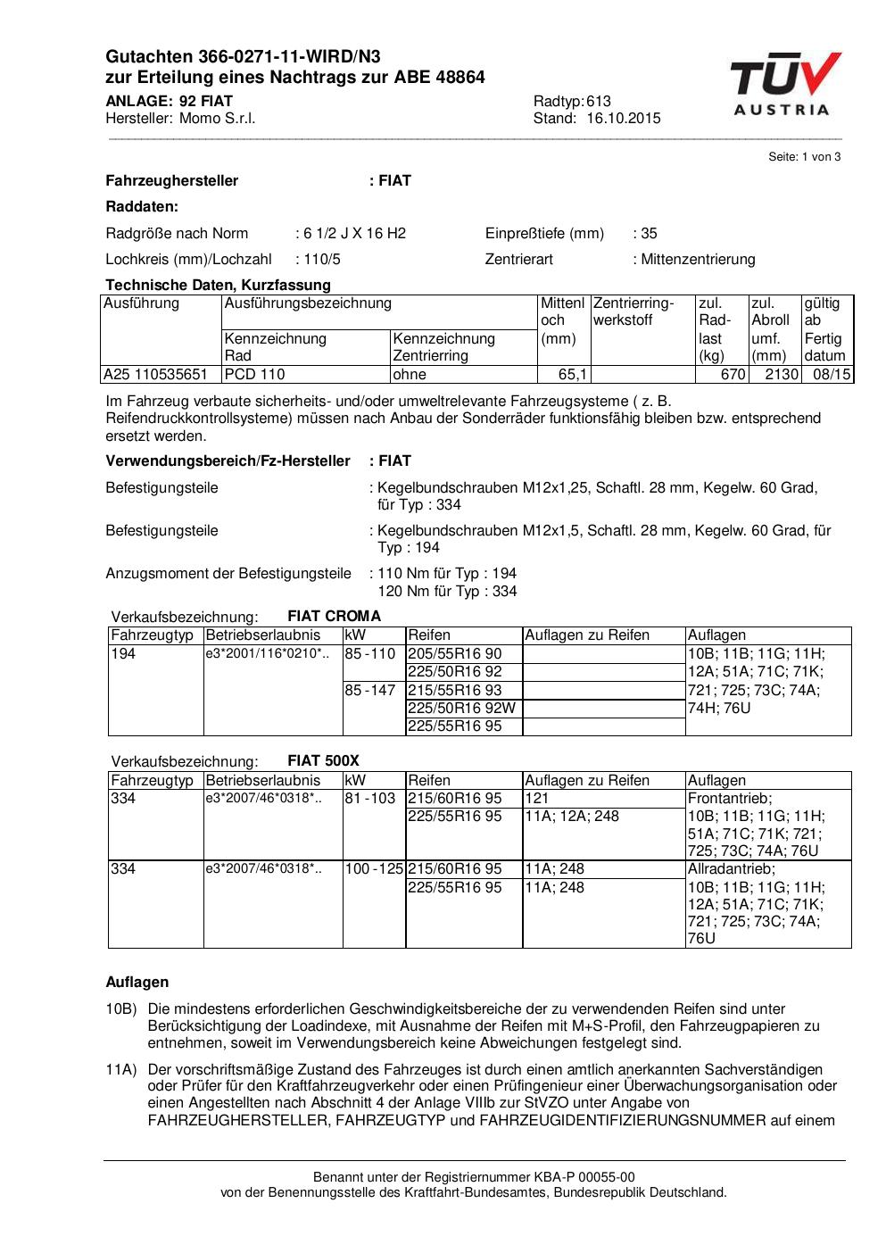 Felgengutachten / ABE für Alufelgen Momo WIN_PRO (6.5Jx16 ET 0, Mittenloch 0 mm) mit KBA 48864 (Zertifikatsnummer 366-0271-11-WIRD/N3__Anlage_92). Hier kostenlos als PDF herunterladen. Der Download-Link ist 24 Stunden gültig und kann bis zu zwei Mal verwendet werden.