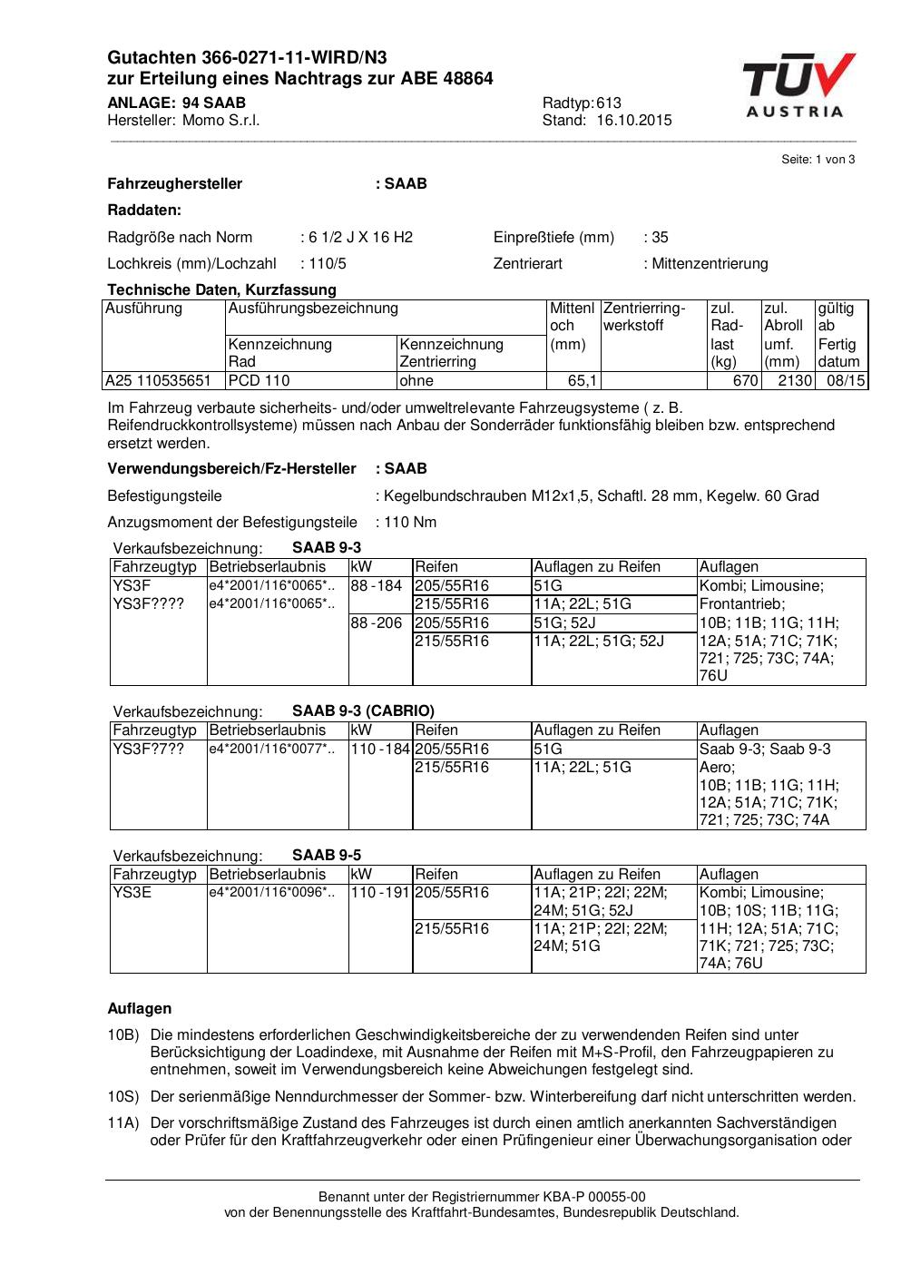 Felgengutachten / ABE für Alufelgen Momo WIN_PRO (6.5Jx16 ET 0, Mittenloch 0 mm) mit KBA 48864 (Zertifikatsnummer 366-0271-11-WIRD/N3__Anlage_94). Hier kostenlos als PDF herunterladen. Der Download-Link ist 24 Stunden gültig und kann bis zu zwei Mal verwendet werden.