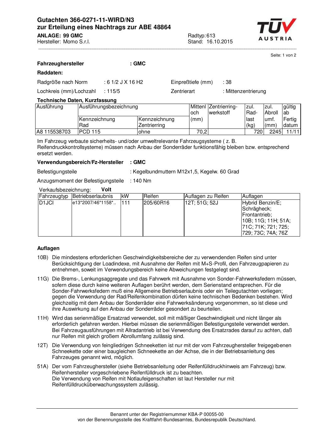 Felgengutachten / ABE für Alufelgen Momo WIN_PRO (6.5Jx16 ET 0, Mittenloch 0 mm) mit KBA 48864 (Zertifikatsnummer 366-0271-11-WIRD/N3__Anlage_99). Hier kostenlos als PDF herunterladen. Der Download-Link ist 24 Stunden gültig und kann bis zu zwei Mal verwendet werden.