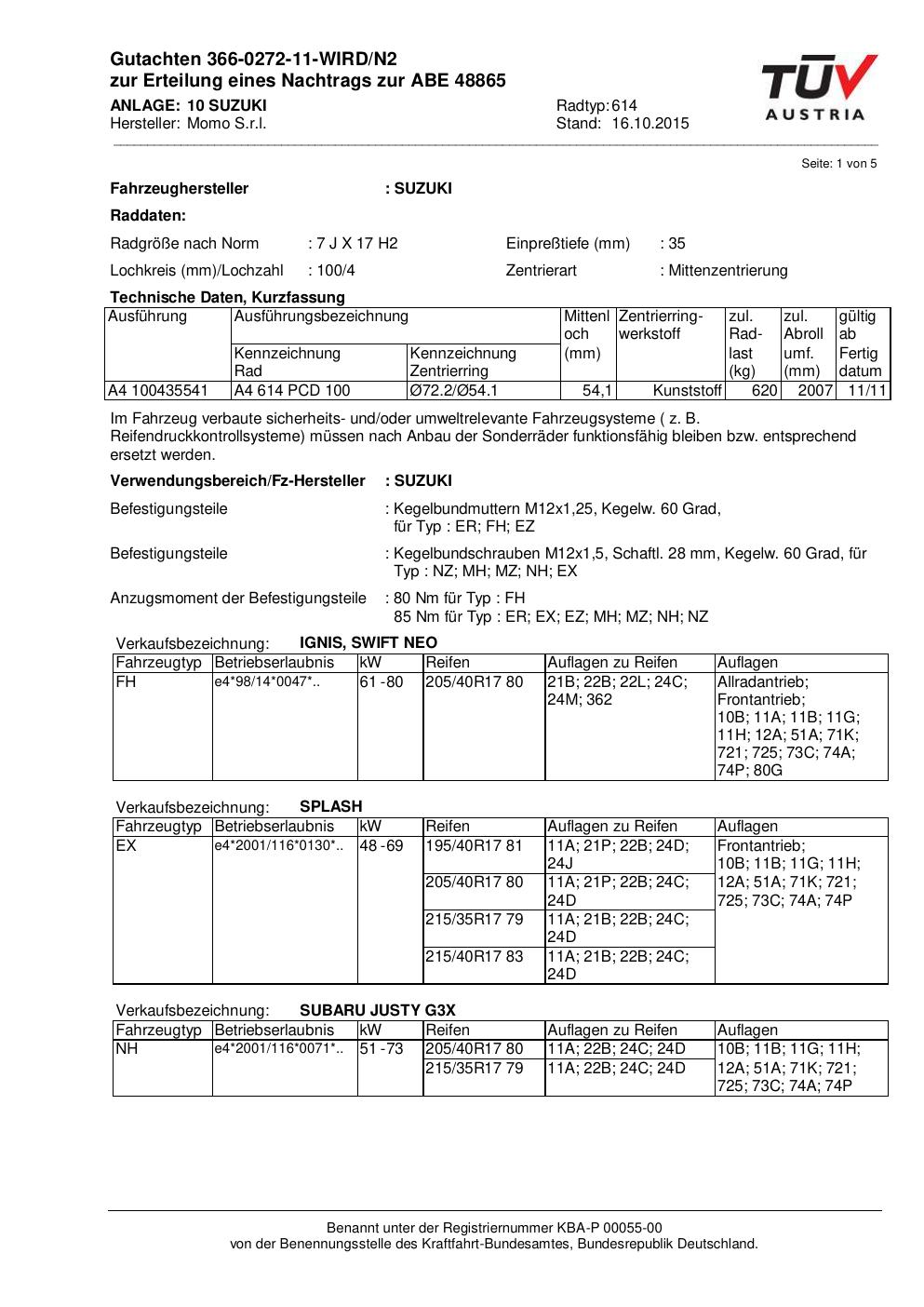Felgengutachten / ABE für Alufelgen Momo WIN_PRO (7Jx17 ET 0, Mittenloch 0 mm) mit KBA 48865 (Zertifikatsnummer 366-0272-11-WIRD/N2__Anlage_10). Hier kostenlos als PDF herunterladen. Der Download-Link ist 24 Stunden gültig und kann bis zu zwei Mal verwendet werden.