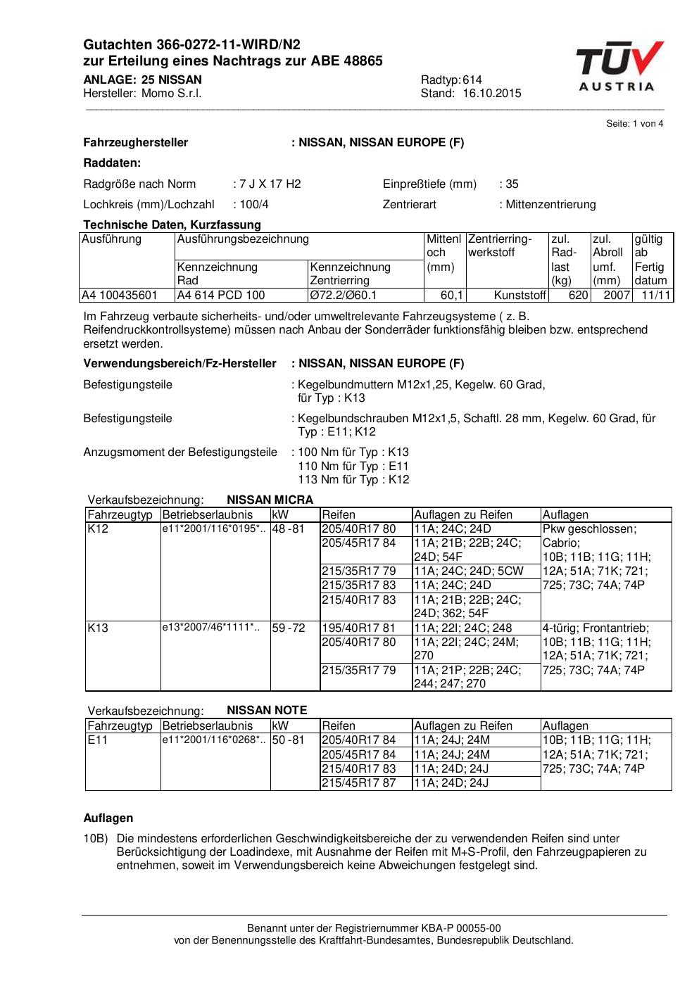 Felgengutachten / ABE für Alufelgen Momo WIN_PRO (7Jx17 ET 0, Mittenloch 0 mm) mit KBA 48865 (Zertifikatsnummer 366-0272-11-WIRD/N2__Anlage_25). Hier kostenlos als PDF herunterladen. Der Download-Link ist 24 Stunden gültig und kann bis zu zwei Mal verwendet werden.