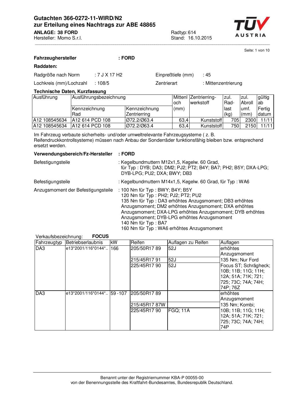 Felgengutachten / ABE für Alufelgen Momo WIN_PRO (7Jx17 ET 0, Mittenloch 0 mm) mit KBA 48865 (Zertifikatsnummer 366-0272-11-WIRD/N2__Anlage_38). Hier kostenlos als PDF herunterladen. Der Download-Link ist 24 Stunden gültig und kann bis zu zwei Mal verwendet werden.