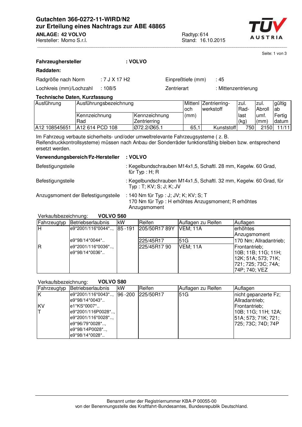 Felgengutachten / ABE für Alufelgen Momo WIN_PRO (7Jx17 ET 0, Mittenloch 0 mm) mit KBA 48865 (Zertifikatsnummer 366-0272-11-WIRD/N2__Anlage_42). Hier kostenlos als PDF herunterladen. Der Download-Link ist 24 Stunden gültig und kann bis zu zwei Mal verwendet werden.