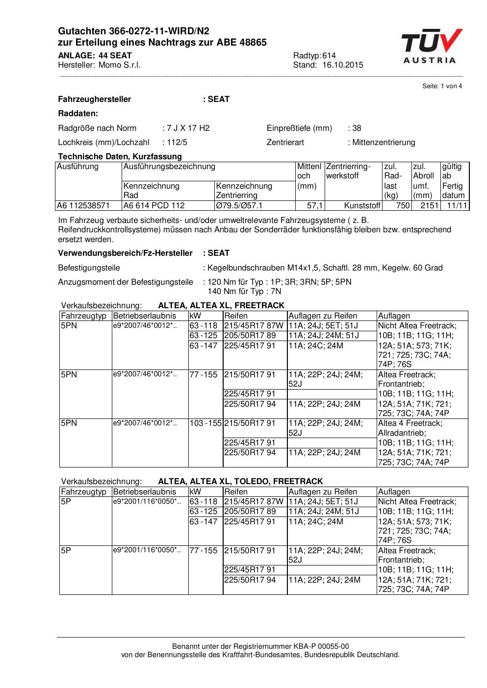 Felgengutachten / ABE für Alufelgen Momo WIN_PRO (7Jx17 ET 0, Mittenloch 0 mm) mit KBA 48865 (Zertifikatsnummer 366-0272-11-WIRD/N2__Anlage_44). Hier kostenlos als PDF herunterladen. Der Download-Link ist 24 Stunden gültig und kann bis zu zwei Mal verwendet werden.