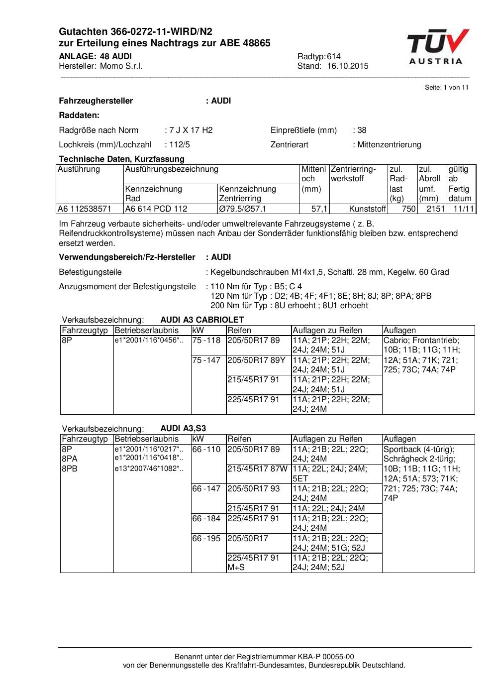 Dieses ABE gehört zur Felge Momo WIN_PRO in 7Jx17 ET0 mit KBA 48865. Die Seite ist dafür gedacht, dass du schnell prüfen kannst, ob KBA, Design und Größe zu deiner Felge passen und danach direkt das richtige PDF lädst.