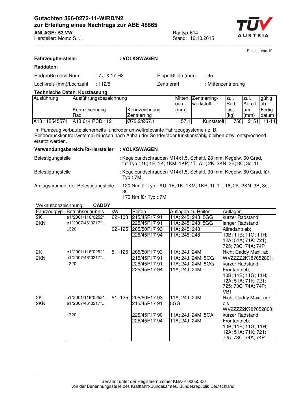 Felgengutachten / ABE für Alufelgen Momo WIN_PRO (7Jx17 ET 0, Mittenloch 0 mm) mit KBA 48865 (Zertifikatsnummer 366-0272-11-WIRD/N2__Anlage_53). Hier kostenlos als PDF herunterladen. Der Download-Link ist 24 Stunden gültig und kann bis zu zwei Mal verwendet werden.