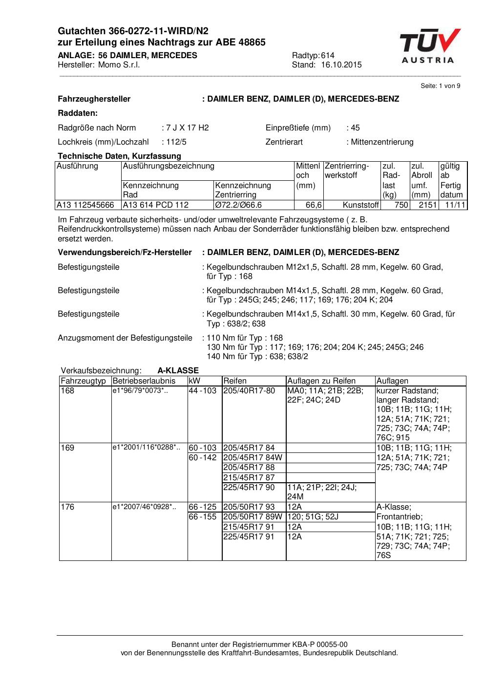 Felgengutachten / ABE für Alufelgen Momo WIN_PRO (7Jx17 ET 0, Mittenloch 0 mm) mit KBA 48865 (Zertifikatsnummer 366-0272-11-WIRD/N2__Anlage_56). Hier kostenlos als PDF herunterladen. Der Download-Link ist 24 Stunden gültig und kann bis zu zwei Mal verwendet werden.