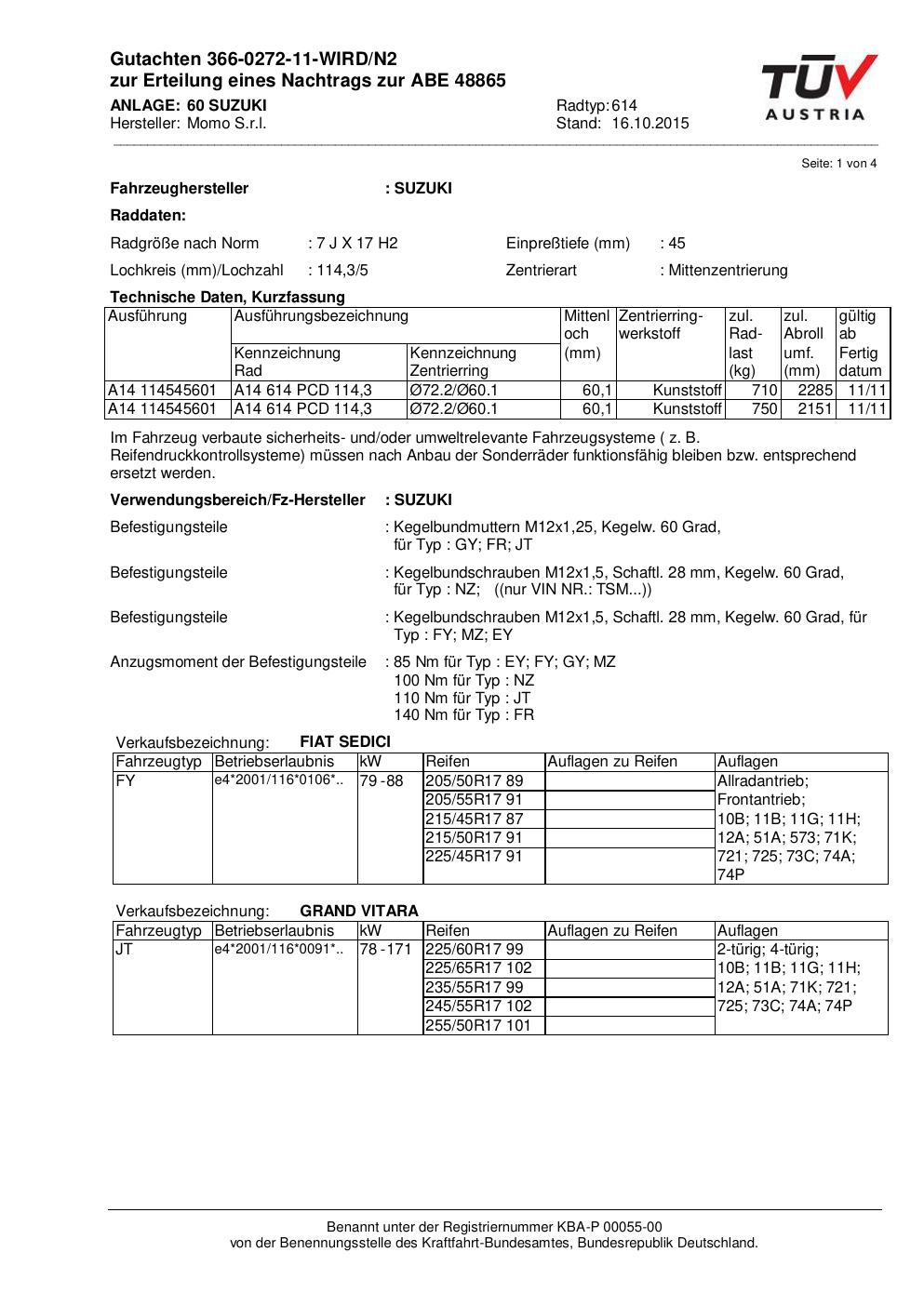 Felgengutachten / ABE für Alufelgen Momo WIN_PRO (7Jx17 ET 0, Mittenloch 0 mm) mit KBA 48865 (Zertifikatsnummer 366-0272-11-WIRD/N2__Anlage_60). Hier kostenlos als PDF herunterladen. Der Download-Link ist 24 Stunden gültig und kann bis zu zwei Mal verwendet werden.
