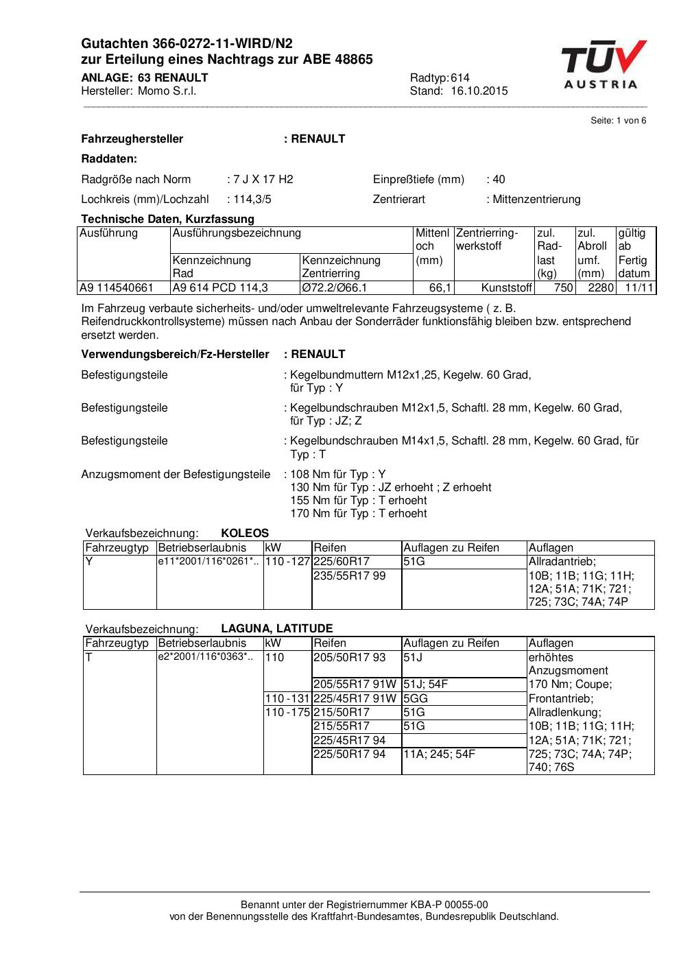 Felgengutachten / ABE für Alufelgen Momo WIN_PRO (7Jx17 ET 0, Mittenloch 0 mm) mit KBA 48865 (Zertifikatsnummer 366-0272-11-WIRD/N2__Anlage_63). Hier kostenlos als PDF herunterladen. Der Download-Link ist 24 Stunden gültig und kann bis zu zwei Mal verwendet werden.