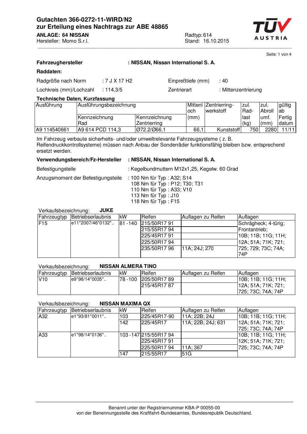 Felgengutachten / ABE für Alufelgen Momo WIN_PRO (7Jx17 ET 0, Mittenloch 0 mm) mit KBA 48865 (Zertifikatsnummer 366-0272-11-WIRD/N2__Anlage_64). Hier kostenlos als PDF herunterladen. Der Download-Link ist 24 Stunden gültig und kann bis zu zwei Mal verwendet werden.