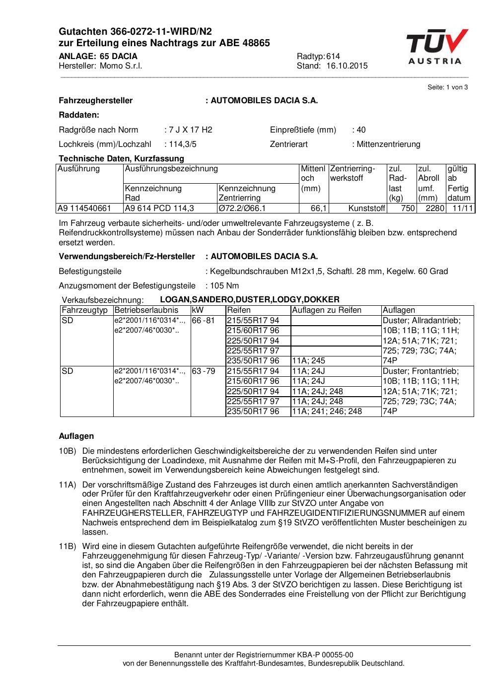 Felgengutachten / ABE für Alufelgen Momo WIN_PRO (7Jx17 ET 0, Mittenloch 0 mm) mit KBA 48865 (Zertifikatsnummer 366-0272-11-WIRD/N2__Anlage_65). Hier kostenlos als PDF herunterladen. Der Download-Link ist 24 Stunden gültig und kann bis zu zwei Mal verwendet werden.