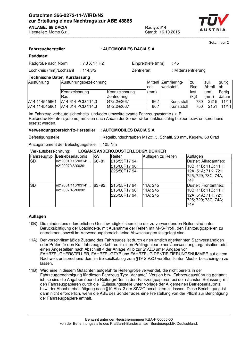 Felgengutachten / ABE für Alufelgen Momo WIN_PRO (7Jx17 ET 0, Mittenloch 0 mm) mit KBA 48865 (Zertifikatsnummer 366-0272-11-WIRD/N2__Anlage_68). Hier kostenlos als PDF herunterladen. Der Download-Link ist 24 Stunden gültig und kann bis zu zwei Mal verwendet werden.