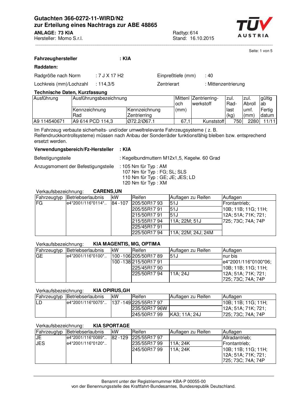 Felgengutachten / ABE für Alufelgen Momo WIN_PRO (7Jx17 ET 0, Mittenloch 0 mm) mit KBA 48865 (Zertifikatsnummer 366-0272-11-WIRD/N2__Anlage_73). Hier kostenlos als PDF herunterladen. Der Download-Link ist 24 Stunden gültig und kann bis zu zwei Mal verwendet werden.