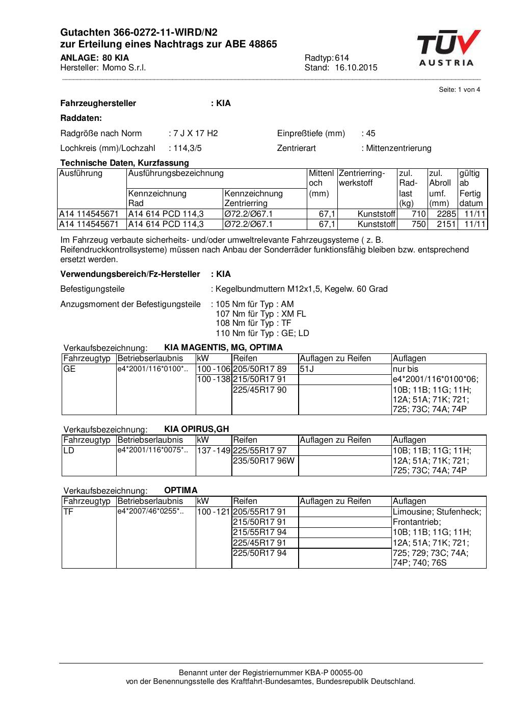 Felgengutachten / ABE für Alufelgen Momo WIN_PRO (7Jx17 ET 0, Mittenloch 0 mm) mit KBA 48865 (Zertifikatsnummer 366-0272-11-WIRD/N2__Anlage_80). Hier kostenlos als PDF herunterladen. Der Download-Link ist 24 Stunden gültig und kann bis zu zwei Mal verwendet werden.