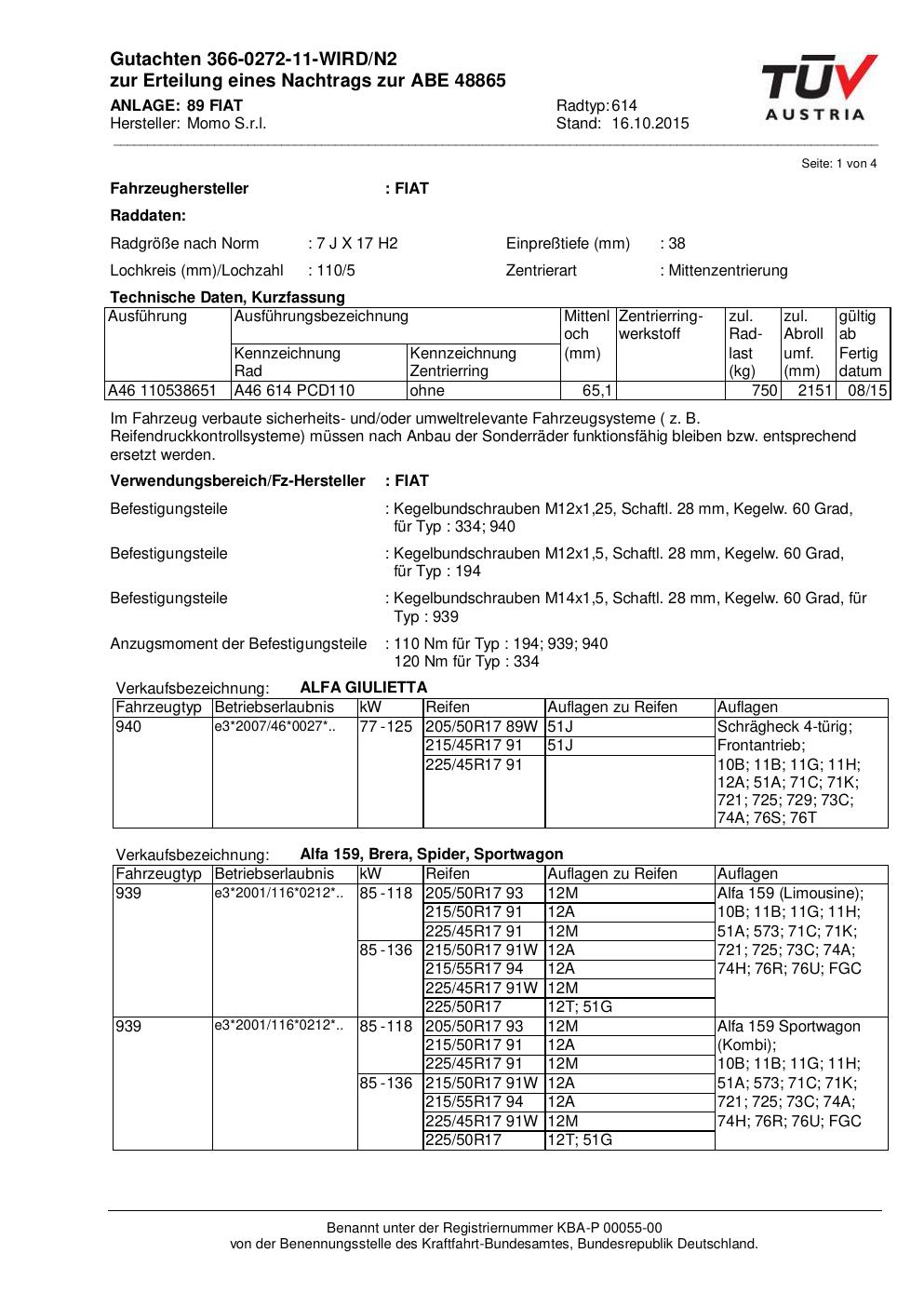 Felgengutachten / ABE für Alufelgen Momo WIN_PRO (7Jx17 ET 0, Mittenloch 0 mm) mit KBA 48865 (Zertifikatsnummer 366-0272-11-WIRD/N2__Anlage_89). Hier kostenlos als PDF herunterladen. Der Download-Link ist 24 Stunden gültig und kann bis zu zwei Mal verwendet werden.