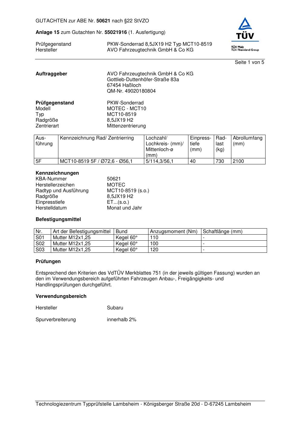 Felgengutachten / abe für Alufelgen MOTEC (AVO Fahrzeugtechnik GmbH & Co KG) MCT10-8519 (ET 0, Mittenloch 0 mm) mit KBA 50621 (Zertifikatsnummer 50621). Hier kostenlos als PDF herunterladen. Der Download-Link ist 24 Stunden gültig und kann bis zu zwei Mal verwendet werden.
