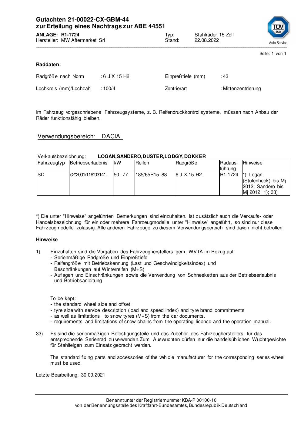• Stimmt die KBA-Nummer auf der Felge mit diesem Dokument überein?