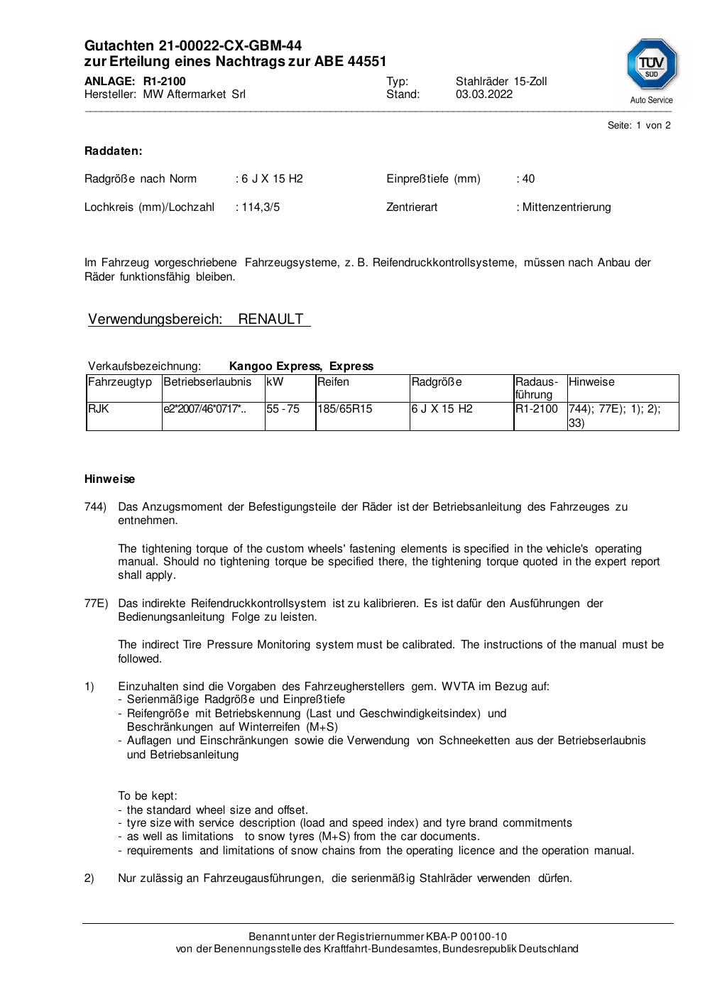 - Stimmt die KBA-Nummer auf der Felge mit diesem Dokument überein?