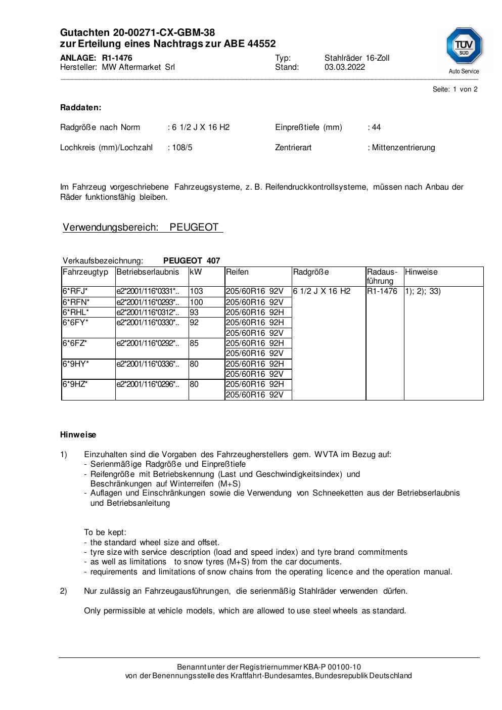 Dieses Gutachten (abe) bezieht sich auf die Alufelge MSW R1-1732 in der Ausführung ET 0, Mittenloch 0 mm (KBA 44552). Im PDF findest du typischerweise zulässige Reifengrößen, Auflagen/Anbauhinweise und – je nach Dokument – Hinweise zur Eintragung.