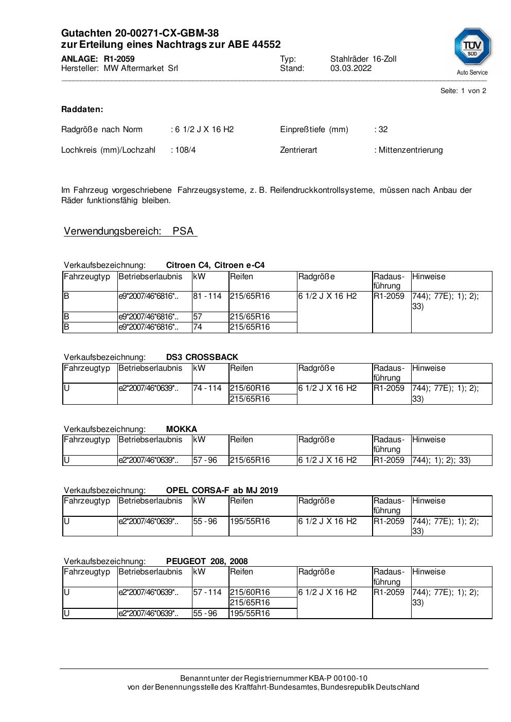 Dieses Gutachten (abe) bezieht sich auf die Alufelge MSW R1-1732 in der Ausführung ET 0, Mittenloch 0 mm (KBA 44552). Im PDF findest du typischerweise zulässige Reifengrößen, Auflagen/Anbauhinweise und – je nach Dokument – Hinweise zur Eintragung.