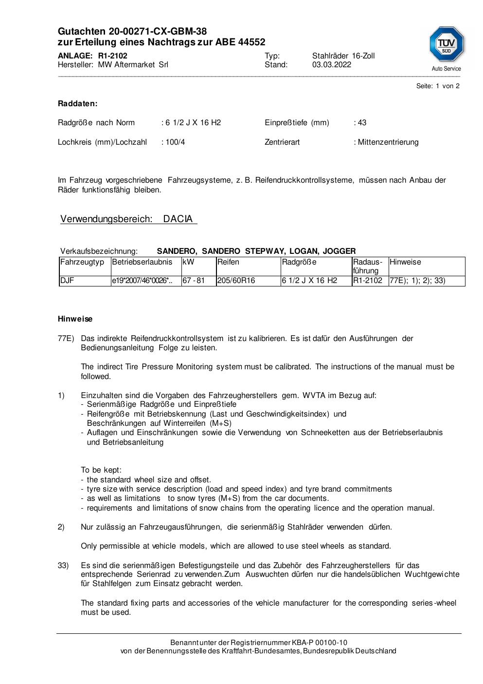 Dieses Gutachten (abe) bezieht sich auf die Alufelge MW Aftermarket Srl 1852 in der Ausführung ET 0, Mittenloch 0 mm (KBA 44552). Im PDF findest du typischerweise zulässige Reifengrößen, Auflagen/Anbauhinweise und – je nach Dokument – Hinweise zur Eintragung.