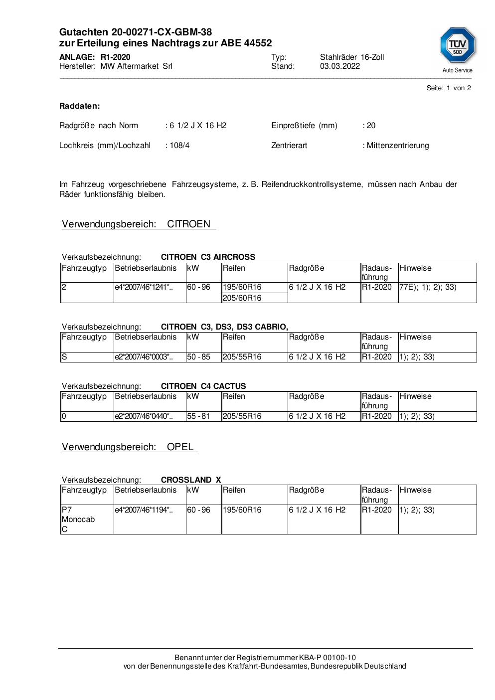 Dieses Gutachten (abe) bezieht sich auf die Alufelge MW Aftermarket Srl R1-1732 in der Ausführung ET 0, Mittenloch 0 mm (KBA 44552). Im PDF findest du typischerweise zulässige Reifengrößen, Auflagen/Anbauhinweise und – je nach Dokument – Hinweise zur Eintragung.