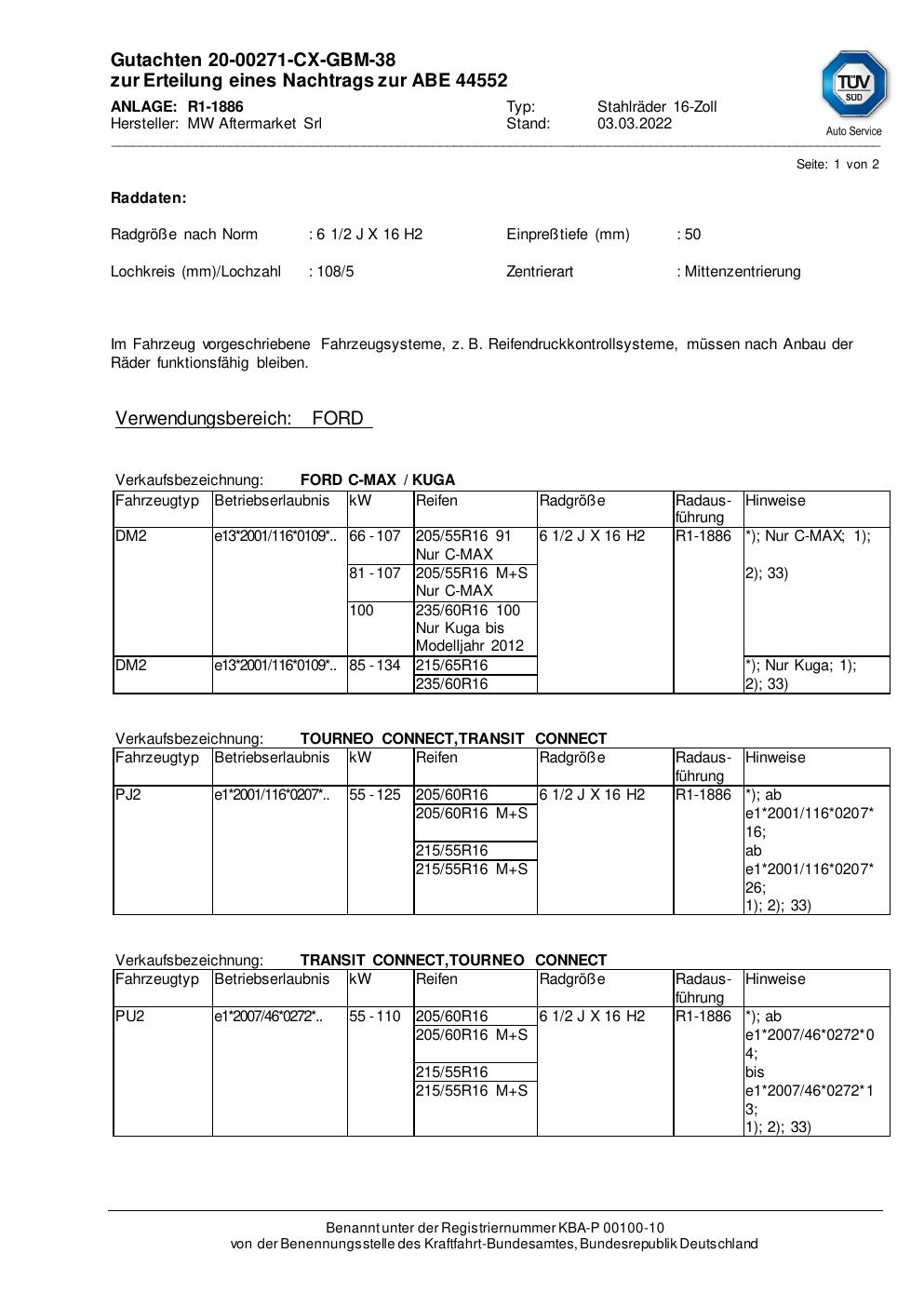 Dieses Gutachten (abe) bezieht sich auf die Alufelge MW Aftermarket Srl R1-1732 in der Ausführung ET 0, Mittenloch 0 mm (KBA 44552). Im PDF findest du typischerweise zulässige Reifengrößen, Auflagen/Anbauhinweise und – je nach Dokument – Hinweise zur Eintragung.