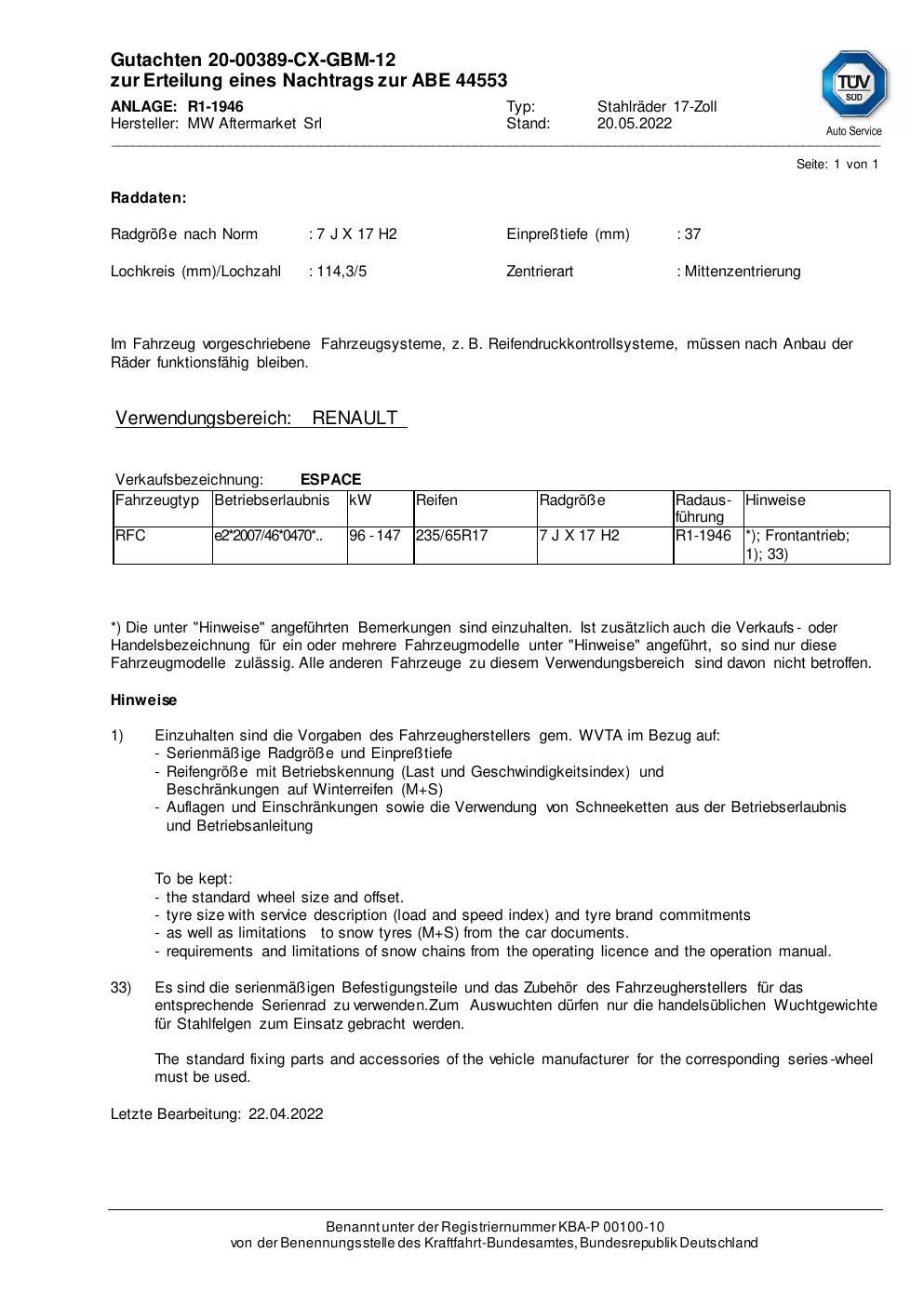 Dieses Gutachten (abe) bezieht sich auf die Alufelge MW Aftermarket Srl 1944 in der Ausführung ET 0, Mittenloch 0 mm (KBA 44553). Im PDF findest du typischerweise zulässige Reifengrößen, Auflagen/Anbauhinweise und – je nach Dokument – Hinweise zur Eintragung.