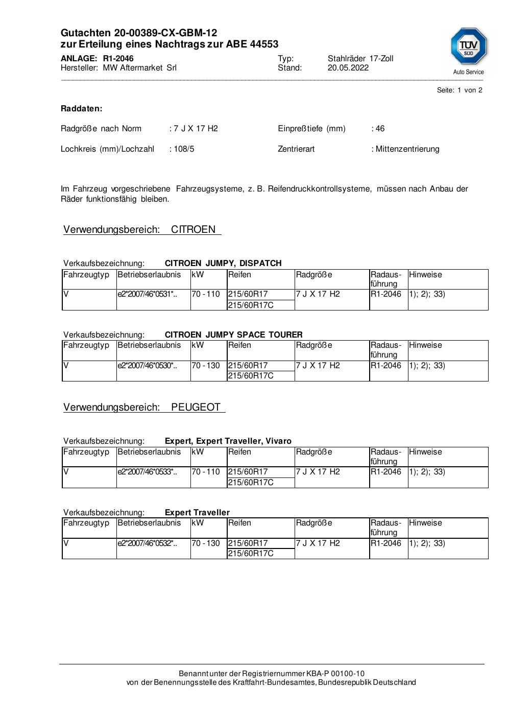 Dieses Gutachten (abe) bezieht sich auf die Alufelge MW Aftermarket Srl R1-1778 in der Ausführung ET 0, Mittenloch 0 mm (KBA 44553). Im PDF findest du typischerweise zulässige Reifengrößen, Auflagen/Anbauhinweise und – je nach Dokument – Hinweise zur Eintragung.
