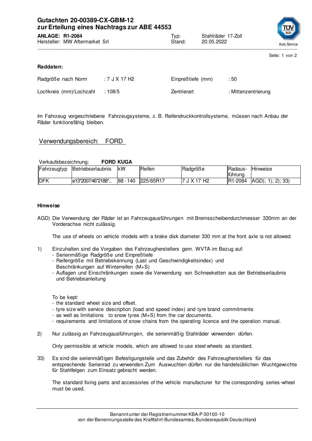 Dieses Gutachten (abe) bezieht sich auf die Alufelge MW Aftermarket Srl R1-1778 in der Ausführung ET 0, Mittenloch 0 mm (KBA 44553). Im PDF findest du typischerweise zulässige Reifengrößen, Auflagen/Anbauhinweise und – je nach Dokument – Hinweise zur Eintragung.