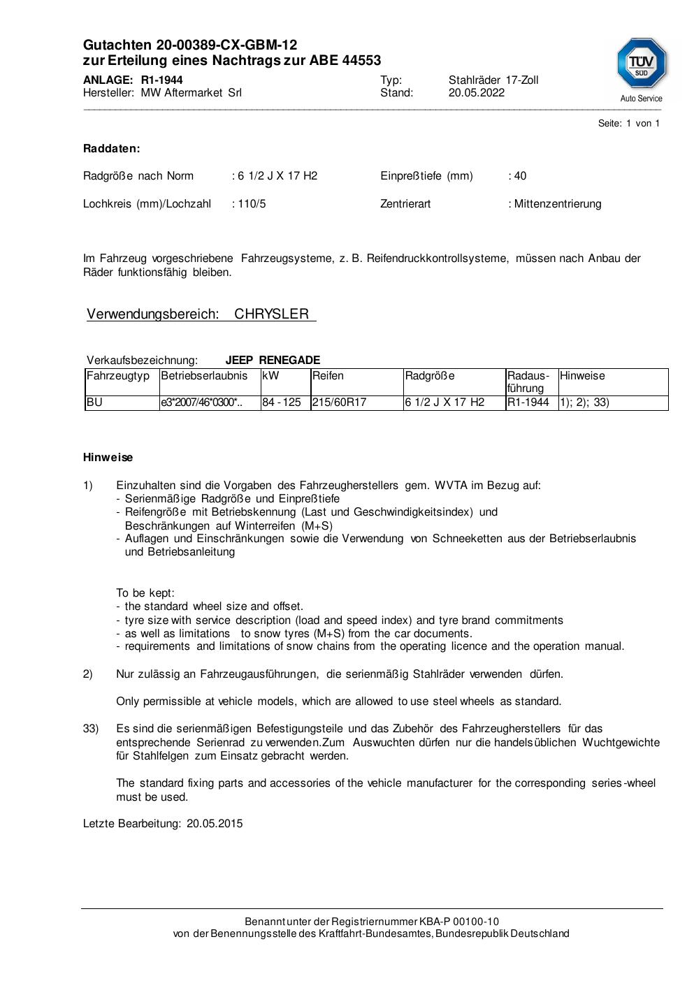 Dieses Gutachten (abe) bezieht sich auf die Alufelge MW Aftermarket Srl 1944 in der Ausführung ET 0, Mittenloch 0 mm (KBA 44553). Im PDF findest du typischerweise zulässige Reifengrößen, Auflagen/Anbauhinweise und – je nach Dokument – Hinweise zur Eintragung.