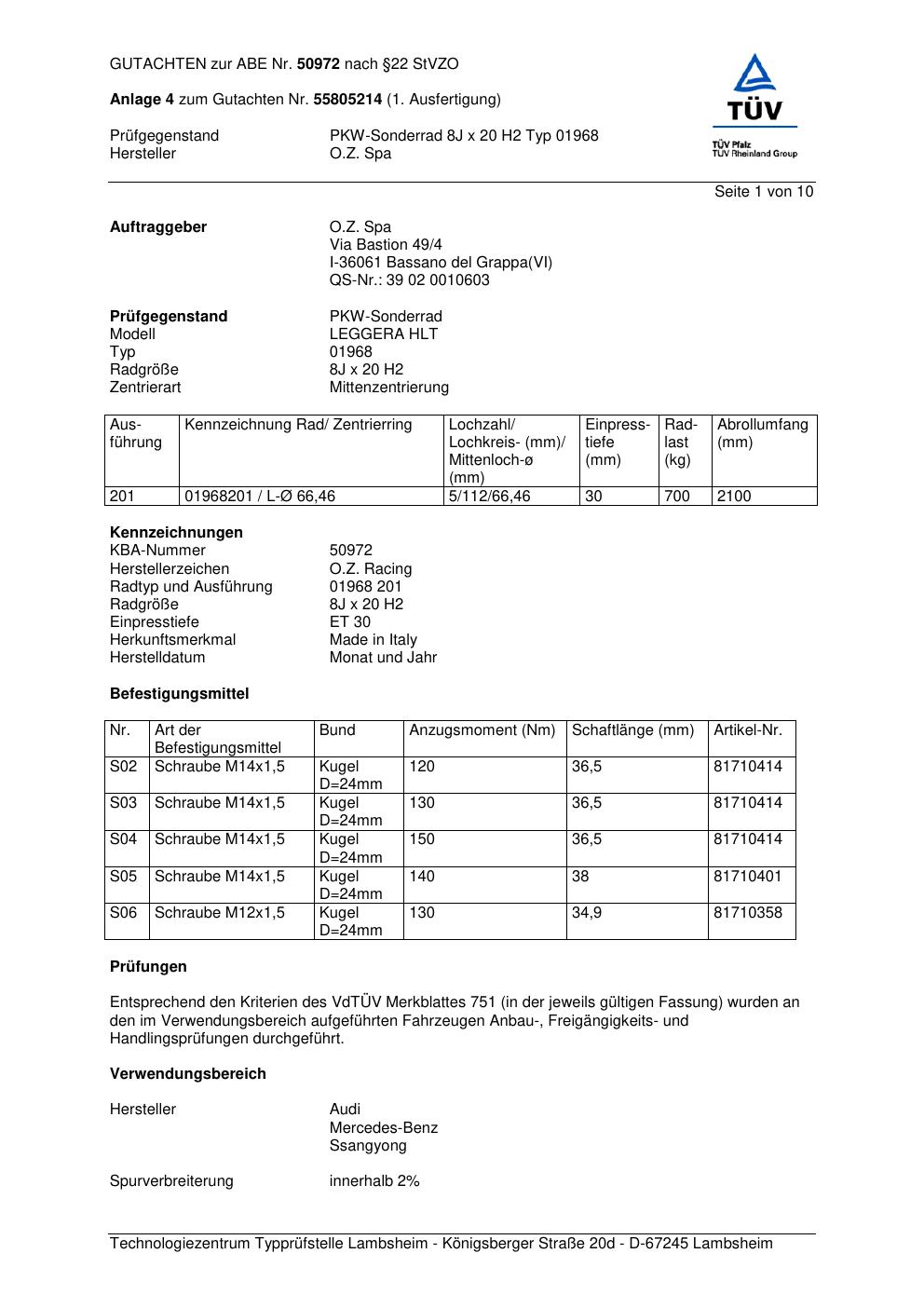 Dieses Gutachten (abe) bezieht sich auf die Alufelge O.Z. Racing (O.Z. Spa) 01968 in der Ausführung ET 0, Mittenloch 0 mm (KBA 50972). Im PDF findest du typischerweise zulässige Reifengrößen, Auflagen/Anbauhinweise und – je nach Dokument – Hinweise zur Eintragung.