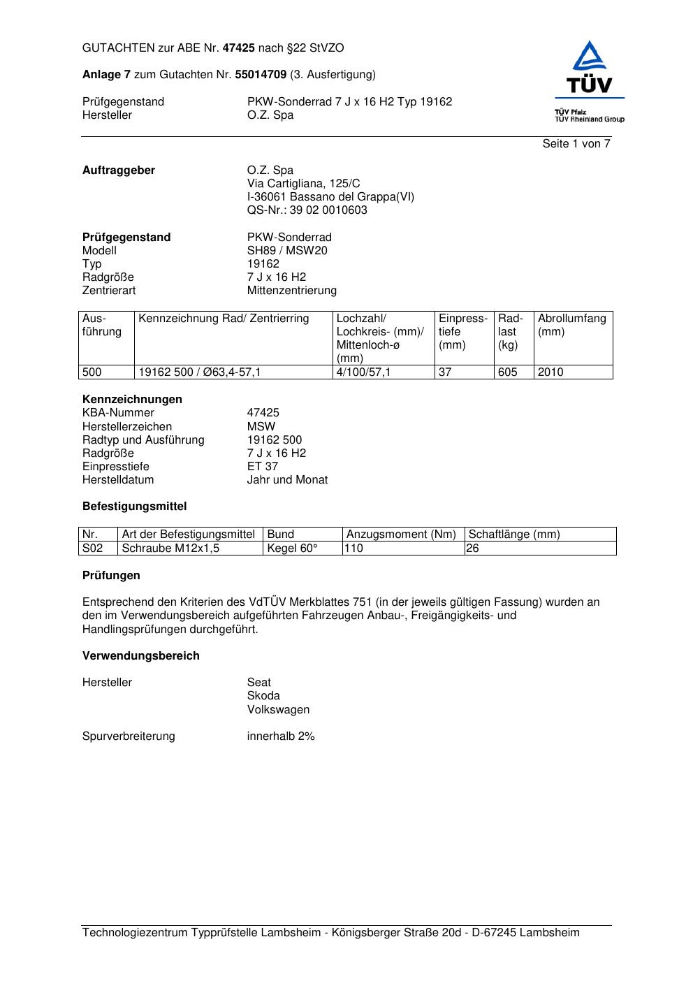 Dieses Gutachten (abe) bezieht sich auf die Alufelge O.Z. Spa 19162 in der Ausführung ET 0, Mittenloch 0 mm (KBA 47425). Im PDF findest du typischerweise zulässige Reifengrößen, Auflagen/Anbauhinweise und – je nach Dokument – Hinweise zur Eintragung.