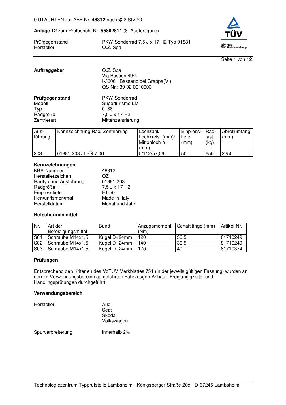 Dieses abe gehört zur Felge O.Z. Racing 0188 1 in ET0 mit KBA 48312. Die Seite ist dafür gedacht, dass du schnell prüfen kannst, ob KBA, Design und Größe zu deiner Felge passen und danach direkt das richtige PDF lädst.