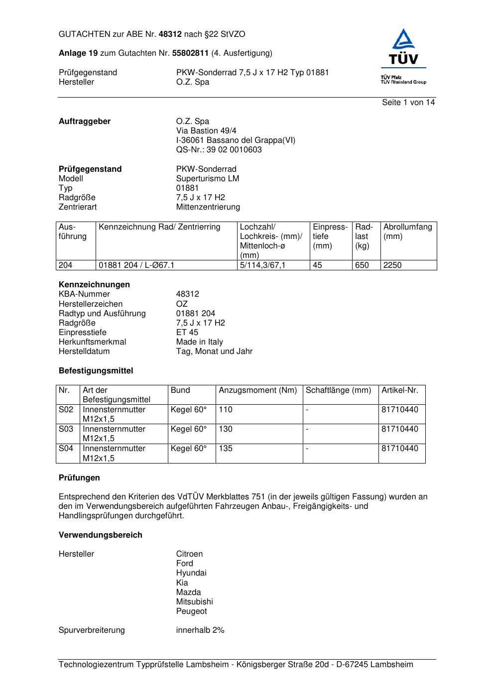 Dieses abe gehört zur Felge O.Z. Racing 0188 1 in ET0 mit KBA 48312. Die Seite ist dafür gedacht, dass du schnell prüfen kannst, ob KBA, Design und Größe zu deiner Felge passen und danach direkt das richtige PDF lädst.