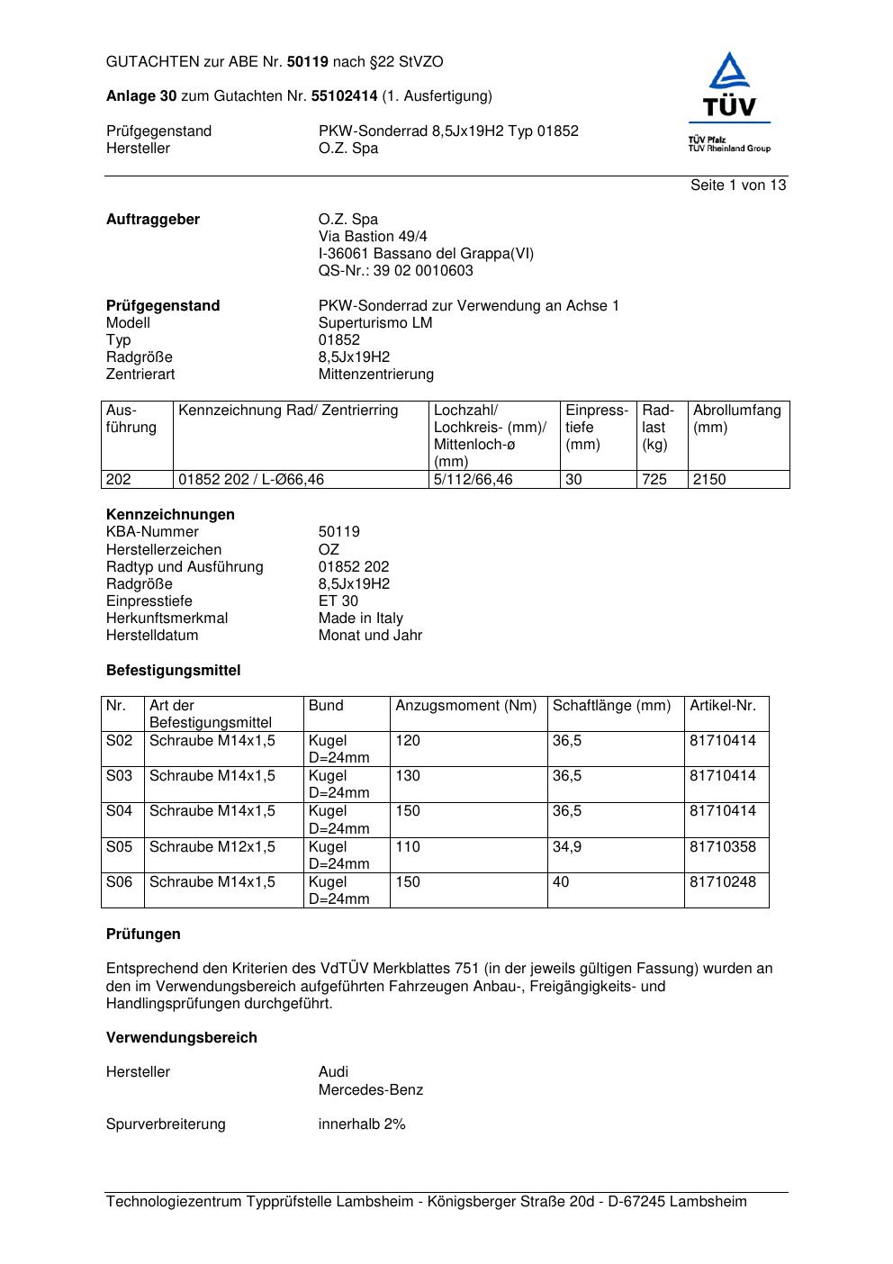 Dieses Gutachten (abe) bezieht sich auf die Alufelge O.Z. Spa 01852 in der Ausführung ET 0, Mittenloch 0 mm (KBA 50119). Im PDF findest du typischerweise zulässige Reifengrößen, Auflagen/Anbauhinweise und – je nach Dokument – Hinweise zur Eintragung.